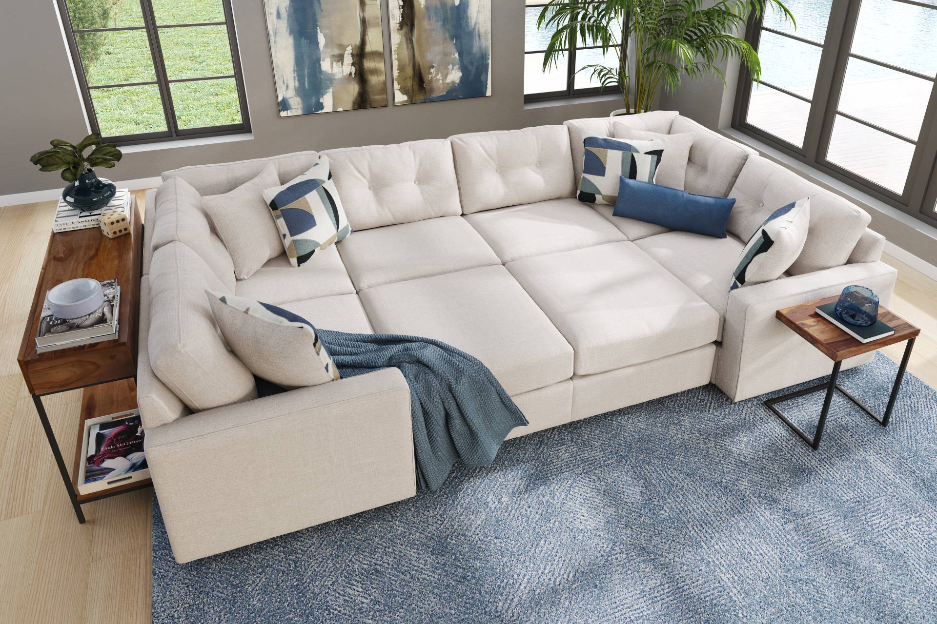 Discover the limitless possibilities of the Drew & Jonathan ModularOne, thoughtfully designed with comfort and flexibility in mind. This customizable seating solution features individual pieces that can be reconfigured to the shape you need. Game days, movie nights, sleepovers, and everyday relaxation are all better when the seating arrangement you want is always right at your fingertips. Each individual piece is upholstered on all sides in our signature fabric, Miller. This textured, oyster colored fabric includes Repreve yarn, made with recycled plastic bottles. The seating area has welted track arms, top-stitched seat cushions and button-tufted back cushions for an elegant silhouette. Two ottomans on casters slide into the middle and lock in place to create a cozy area the whole family can enjoy. A matching pillow provides the perfect final touch. Includes LAF chair, two corner wedges, two armless chairs, two ottomans and RAF chair. Visit a showroom to learn more about individual components and to work with a sales specialist to customize your own configuration today.
