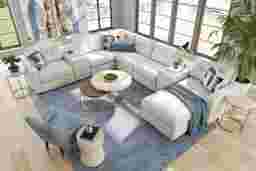 Discover the limitless possibilities of the Drew & Jonathan ModularOne, thoughtfully designed with comfort and flexibility in mind. This customizable seating solution features individual pieces that can be reconfigured to the shape you need. Game days, movie nights, sleepovers, and everyday relaxation are all better when the seating arrangement you want is always right at your fingertips. Each individual piece is upholstered on all sides in our signature fabric, Miller. This textured, oyster colored fabric includes Repreve yarn, made with recycled plastic bottles. The open seating includes a chaise and has welted track arms, top-stitched seat cushions and button-tufted back cushions for an elegant silhouette. Two center consoles provide hidden storage and double as side tables with an acrylic top. A matching pillow provides the perfect final touch. Includes RAF chaise, two consoles, three armless chairs, corner wedge and LAF chair. Visit a showroom to learn more about individual components and to work with a sales specialist to customize your own configuration today.