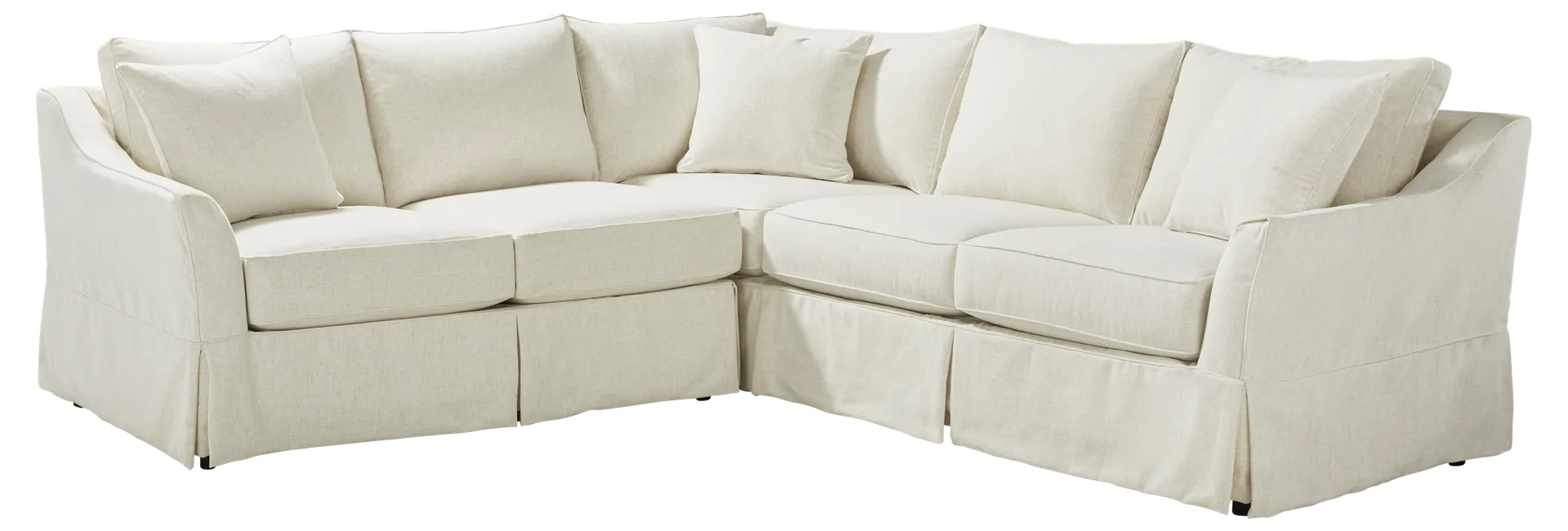 This sectional features a tailored slipcover made from a 50% polyester and 50% cotton woven blend, offering a balance of natural softness and synthetic durability. For general maintenance, we recommend regular vacuuming with a soft brush attachment to remove dust and debris. Because the slipcover is removable, it allows for more thorough maintenance than standard upholstered pieces. Our general care guidelines suggest blotting spills immediately with a clean, dry cloth and using mild soap and water for spot cleaning.