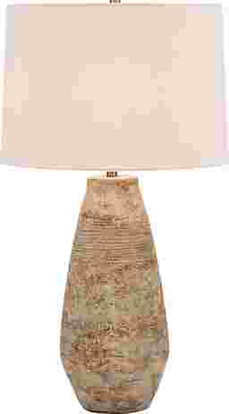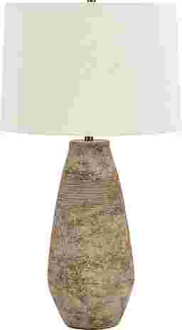 The Paida Beige Lamp feels like a relic softened by sun and time-its tall, gently tapered base carrying a weathered, stone-washed texture that looks as though it was shaped by coastal winds and warm, earthy days. The subtle striations near the top add an artisan's touch, giving the piece depth and soul, while the natural tones create an effortless calm in any room. Paired with a warm, creamy shade, it glows with the quiet beauty of a serene morning light, grounding your space in warmth and understated elegance. Let this naturally textured, soothingly sculptural lamp be the one you bring into your home. Partial assembly may be required.