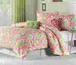 Featuring one of today's hottest styles: damask, the Paige bed set includes cool shades of lime and coral on a white background. For versatility the comforter reverses to a solid coral color. This stylish set includes one twin comforter and one sham. 100% Polyester, Machine wash cold.