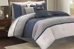 The Palisades comforter set offers a casual, fashionable bedding alternative. The comforter is made of soft MicroSuede in heather gray, navy blue and charcoal gray, reversing to solid navy. The decorative pillows are embroidered and pieced together to add a decorative element to this simple, yet beautiful bedding collection. This set includes one comforter, two shams, one bed skirt and three decorative pillows. 100% Polyester