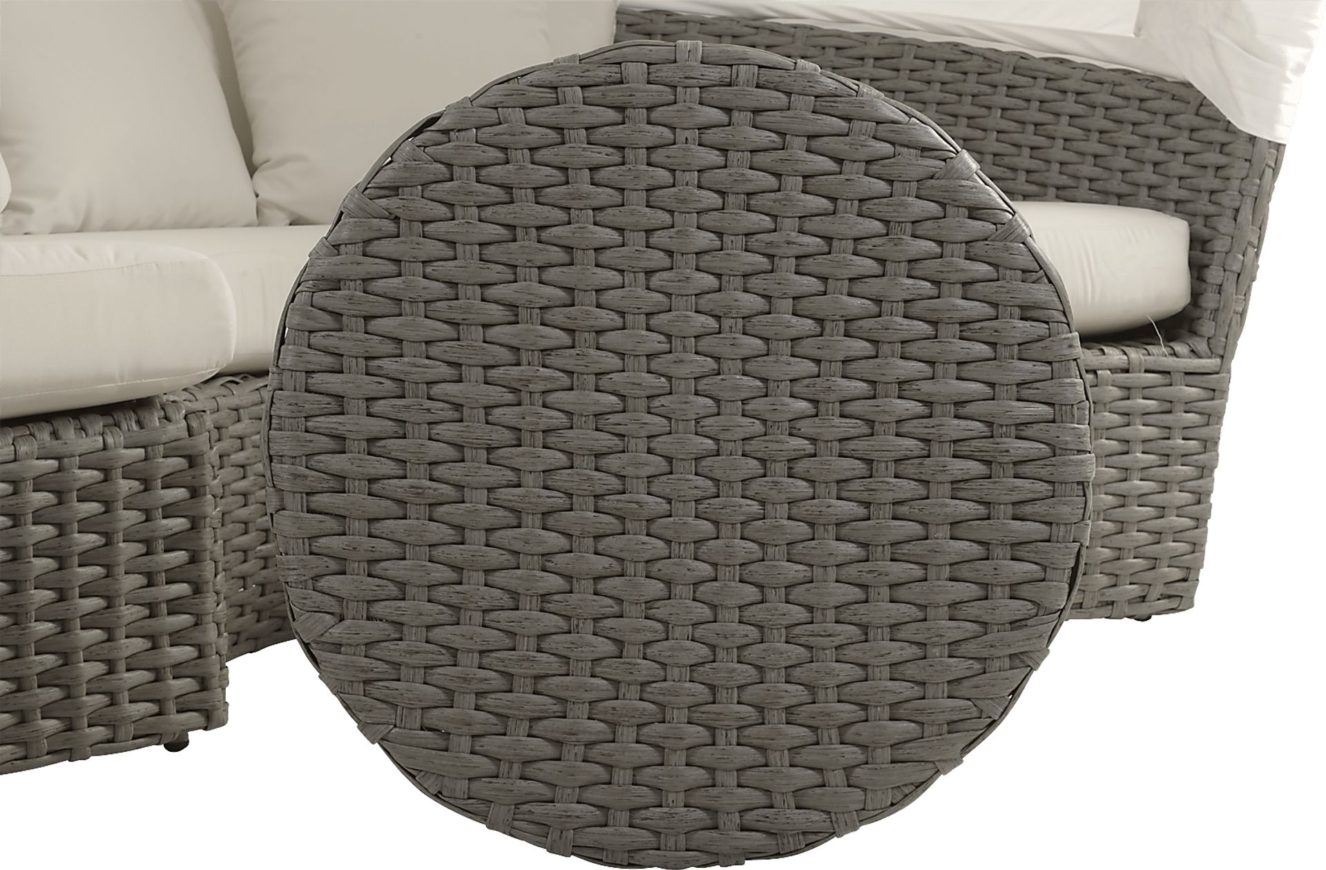 Impressively scaled to fit your large outdoor space, the Palisades daybed creates superior comfort with an approachable modular design. An attractive curved base adds to the appealing silhouette, while brown woven wicker construction is equal parts beautiful and sturdy. Each piece can be separated to conform to your outdoor needs, whether that's lounging comfortably beneath the awning with a book, or sitting around with several friends for a chat. The durable upholstered Sunbrella cushions, in a natural color, are resistant to fading, mildew and mold. Five matching 20 inch pillows are included. 76"H with awning extended. To clean Sunbrella fabric cushions remove dirt and spray on cleaning solution (water and mild soap), then use a soft bristle brush or sponge. Allow cleaning solution to soak into fabric and rinse thoroughly until soap residue is removed. Air dry. Do not dry clean.