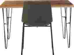 The streamlined industrial look of the Palm Grove desk is emphasized by the metal hairpin legs and clean pine wood solid top in a brown finish. A stylish gray chair provides a comfortable place to sit while enjoying the spacious desk. Customer Assembly Required