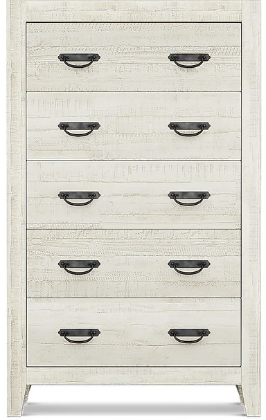 Coastal chic meets classic Arts and Crafts design on the beautiful Palm Grove collection. The bedroom, made of pine veneers, features a white finish that's been wire brushed to create a charming rustic look. Weathered plank detailing on the bed's headboard and low footboard contributes to the casual aesthetic, while straight lines and antique brass finished hardware lend classic Mission style details. Mattress and foundation (if required) sold separately.