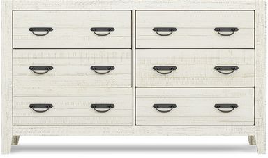 Coastal chic meets classic Arts and Crafts design on the beautiful Palm Grove collection. This bedroom, made of pine veneers, features a white finish that's been wire brushed to create a charming rustic look. Weathered plank detailing on the bed's headboard and low footboard contributes to the casual aesthetic, while straight lines and antique brass finished hardware lend classic Mission style details. Featuring a nightstand and chest, this bedroom is perfectly designed for small spaces.