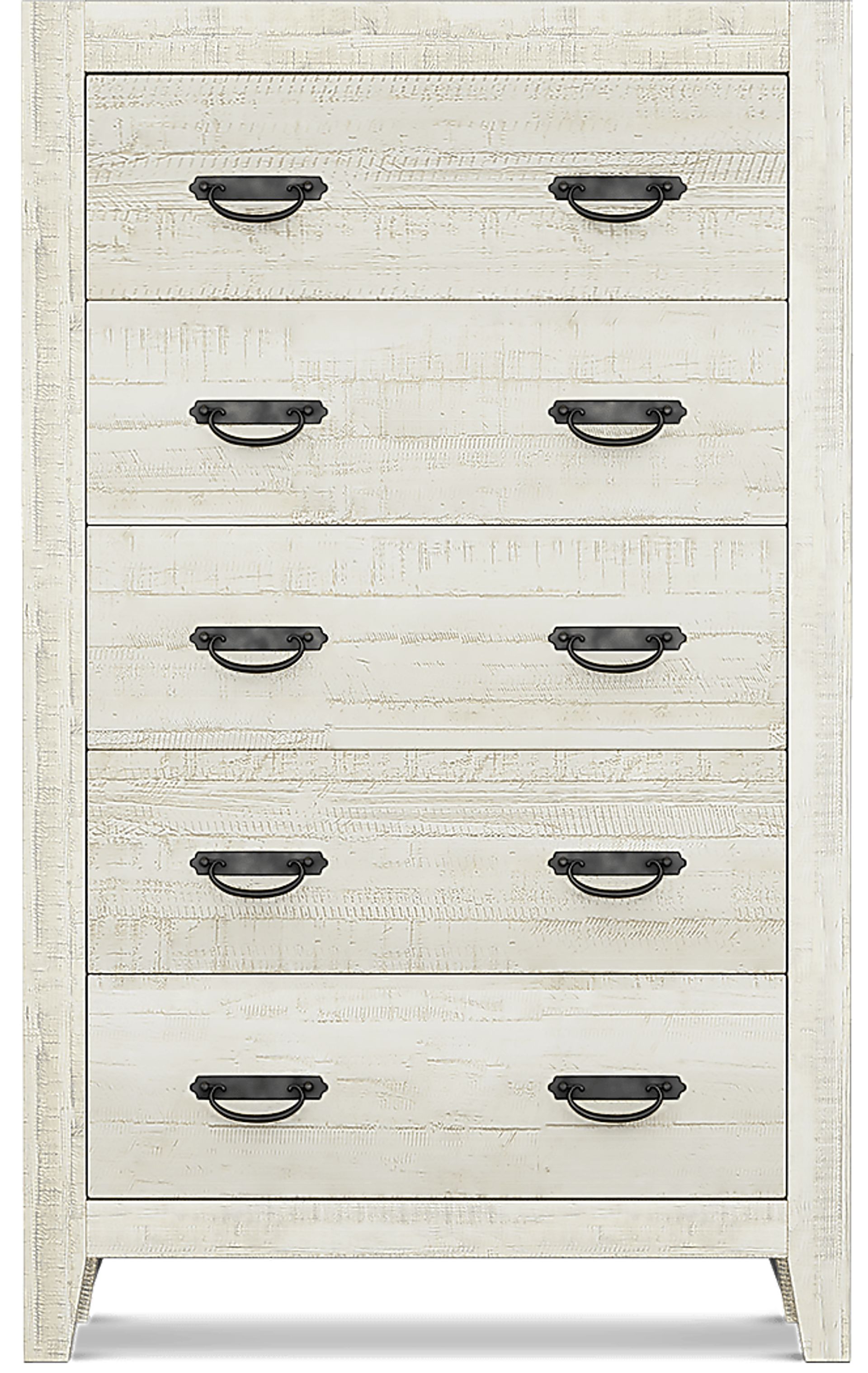 The Palm Grove chest easily proves that storage can be stylish. This coastal chic piece, made with pine veneers, is enhanced by classic Mission style hardware in a lovely antique brass finish. Each of the five spacious drawers is constructed using Euro glides with safety stops. The chest is crafted with pine veneers in a wire brushed weathered white finish.
