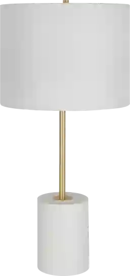 This contemporary, simplistic Palmarito Cave lamp features a white metal base with gold accents. The round hardback shade is a white linen fabric. Partial assembly may be required.