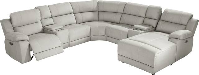 Create the perfect living room for movie watching and getting cozy with the Palmer Point sectional. This simple and stylish piece is the perfect addition to your home thanks to hand dual power reclining, putting you in the perfect position at the press of a button. The soft gray upholstery of this sectional adds to the relaxing feel in a beautiful color to accent your space. The chaise is ideal for laying out with a bowl of popcorn or sneaking in a quick nap. Two consoles add handy storage for remotes and more. 100% Polyester
