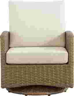 The sun finds its favorite spot as the Paloma outdoor swivel chair provides a seating experience that sets the bar for patio excellence. Woven wicker in light brown brings classic tropical color and texture. The generous sweep of each arm welcomes you in. The soothing swivel base keeps the conversation effortlessly within reach. The seat cushion and back cushion in durable, UV-resistant outdoor fabric are designed to love every season.