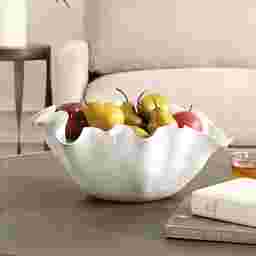 This elegant ceramic Pamau bowl features a stunning ruffled edge design, evoking the delicate shape of a blooming flower. Its soft white glaze with a subtle crackle finish adds texture and sophistication, making it an ideal statement piece for any modern or classic decor. Perfect for displaying as a centerpiece or for functional use, this bowl blends art and practicality effortlessly.