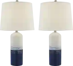 The Pamie Place lamp, set of 2 features a hand-applied three-toned white to blue finish with distress accent on the base. The lamp's beautiful finish conjures the calmness of flowing lake water on ceramic. Topped with a crisp white drum shade that will work in a variety of decor styles. Partial assembly may be required.