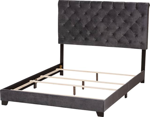 Make the Panola bed the star of your bedroom or guest room. The luxe and glamour-inspired design of the bed is evident in its eye-catching details, including the chrome finished nailhead trim on the headboard. The Panola's frame is built to last with solid rubberwood and engineered wood. The frame and sumptuous headboard are upholstered in gray velvet. The foam-padded headboard features a button-tufted design, adding yet another element of luxury to the Panola. Customer assembly is required.