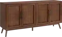 This Pareero credenza is a harmonious blend of style and functionality. Crafted from high-quality hardwood solids in a cinnamon brown finish and adorned with soft woven raffia door fronts and oil rubbed bronze handles, this cabinet exudes warmth and sophistication. The interior features two adjustable and removable shelves, providing customizable storage solutions. Whether gracing your living room as an entertainment console, your dining room as a space saving sideboard, a hallway accent piece, or a storage solution in bedroom, this chest seamlessly complements any space. Tapered legs accentuate the timeless mid-century modern design, making it a statement piece that enhances the aesthetic appeal of any room in your home. Customer assembly is required.