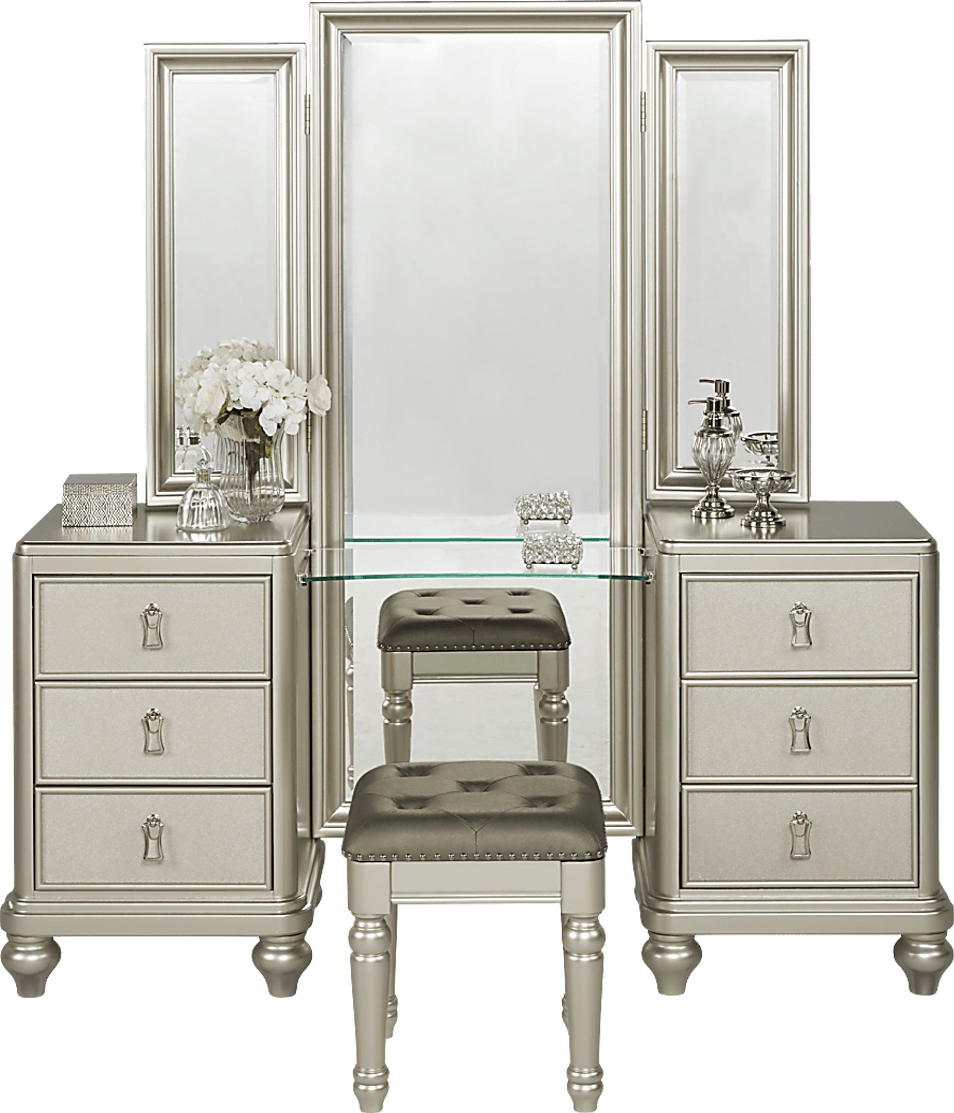 A luxurious spot to primp and preen, the elegant Paris vanity set is both functional and fabulous. Crafted of pine solids and birch veneers in a stunning silver finish, this chic vanity features elegant turned legs and chrome finished drawer pulls. The six useful storage drawers utilize strengthening English and French dovetail construction and include felt lining in the top drawers with a jewelry organizer tray in one drawer. The tri-fold mirror not only includes a full length center mirror, but each of the side mirrors fold in to reveal jewelry hooks on the felt lined backs for hanging storage. The dainty stool features a tufted seat cushion with resilient silver UltraHyde fabric.
