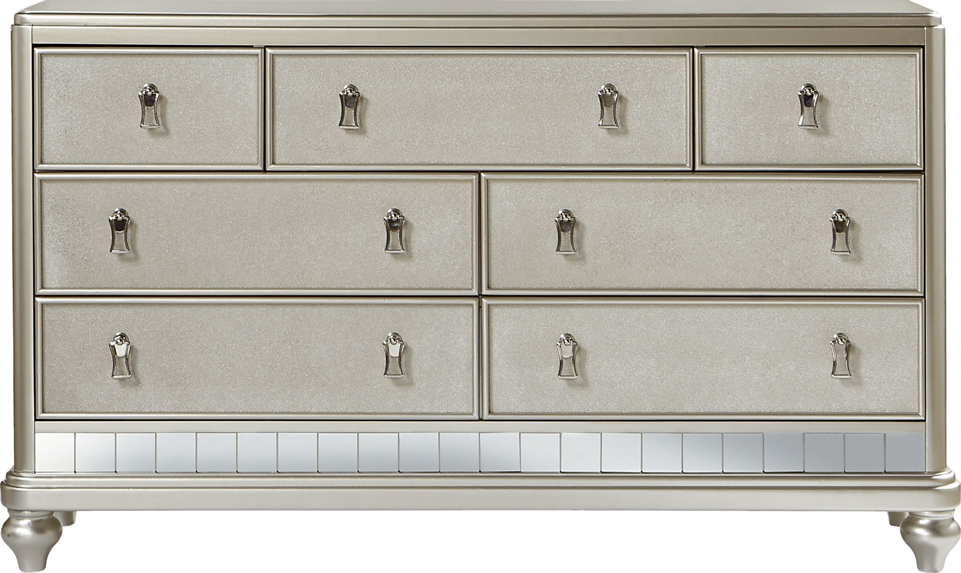 Go glam with the stylish design of the Paris dresser. Expertly crafted of pine solids and birch veneers, this chic dresser stands out thanks to a stunning silver finish, beautifully accented by elegant chrome finished drawer pulls and decorative mirrored panels. With seven spacious drawers, each boasting strengthening English and French dovetail construction, this dresser also features felt lining in the top drawers and includes a jewelry organizer for additional storage capabilities. Turned legs add the finishing touch to this fabulous bedroom essential.