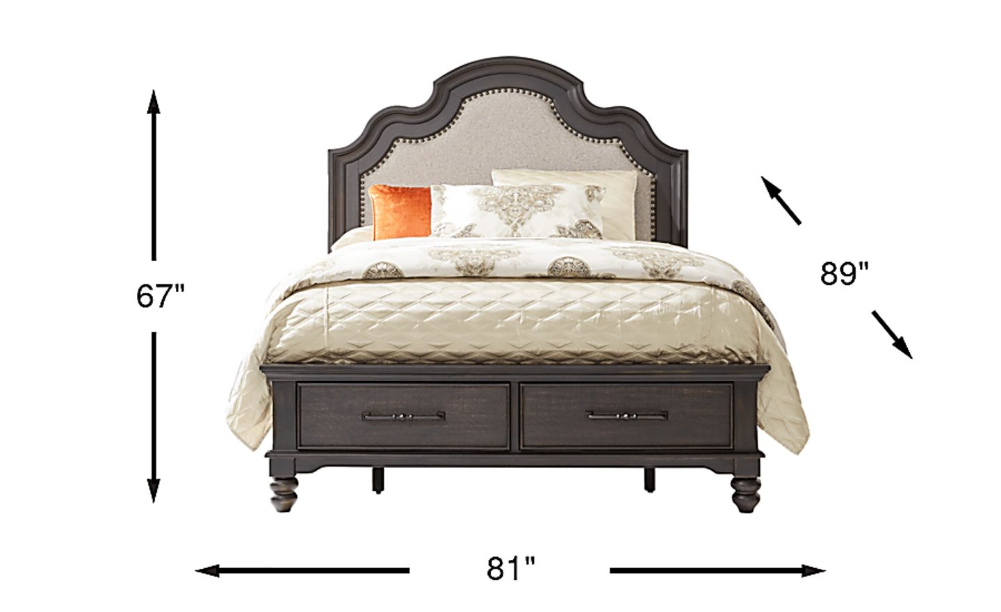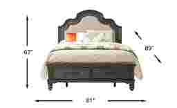 Regal design and understated sophistication in the Park Grove bed bring a modest and timeless feel to your space. Traditional in style and constructed of pine solids, this panel bed features a robust upholstered headboard with an elegant, curved design while the footboard includes two drawers for additional storage and bun style legs that emphasize its ageless aesthetic. Mattress and foundation (if required) sold separately.