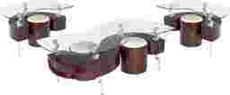 Give your living room a stylish update with the sleek contemporary style of the Park Row table set. The unique design of the S-shaped cocktail table and U-shaped end table is given a thoughtful twist by small round stools on castor wheels that nest neatly inside the glass top tables when not in use. Storage space behind an accordion style door on the cocktail table adds extra functionality. Customer assembly required.