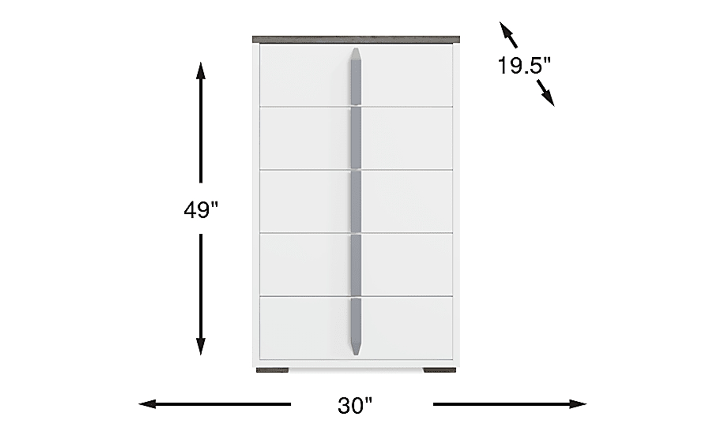 Providing an extra arrangement for storage, the Park Slope chest continues the clean and modern look of this collection. A high gloss white finish and contrasting gray grain finished top enhance the sleek aesthetic. The faux metal hardware pulls run vertically down the center of the chest's five soft close drawers, creating a fresh and unique appeal. Made in Italy.