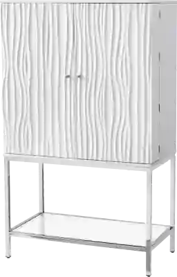 A stunning glossy white finish adds a glamorous touch to the smooth sides and top, and emphasizes the textured design that gives a flowing movement to the front of this breathtaking Parkbook wine cabinet. Perched atop a linear polished chrome framework with a full lower glass shelf, the two doors open onto a spacious interior, with abundant shelving, bottle storage areas, and hanging racks your stemware. What a great way to entertain. Customer assembly is required