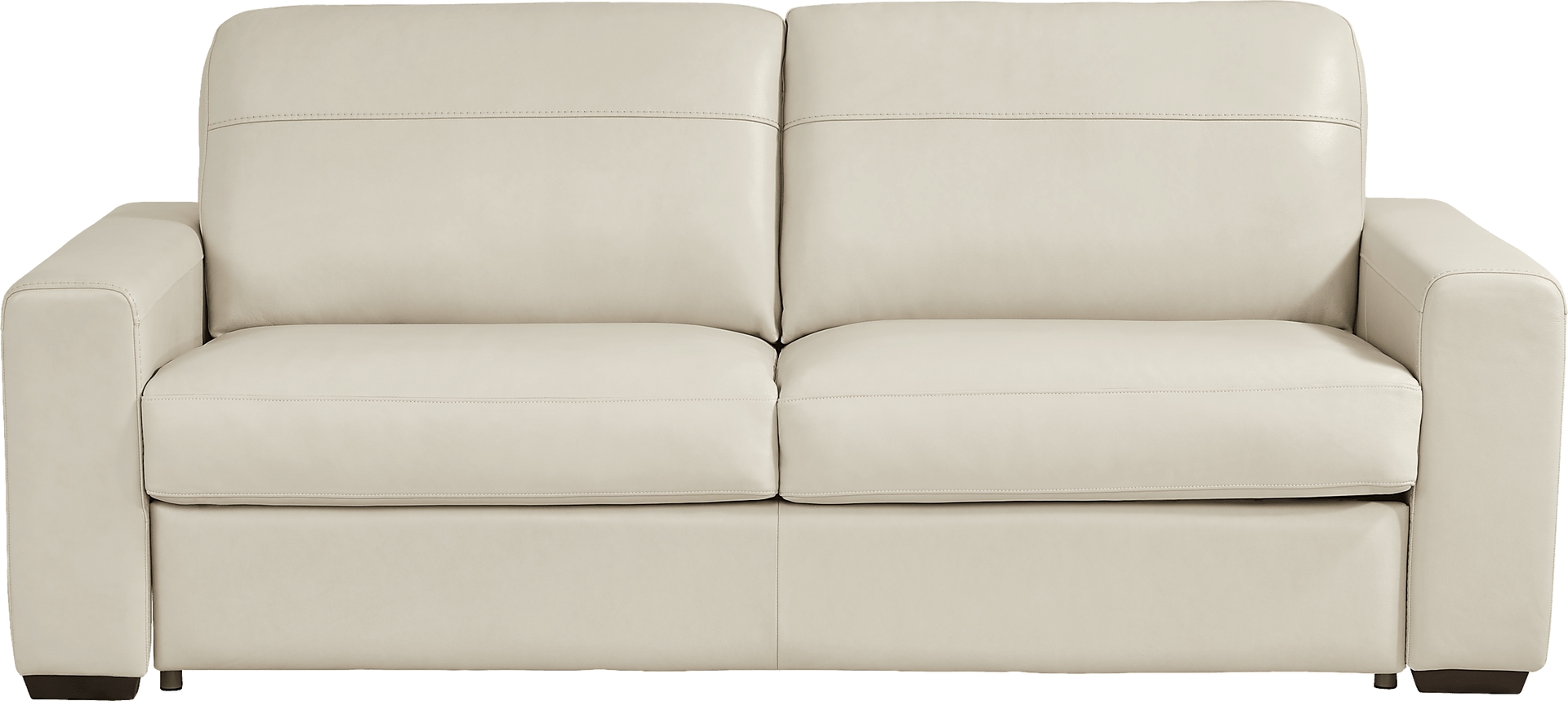 The beckoning aura of a classic leather sofa gets infused with ultra-inviting features that make hosting overnight company easy in the Parker collection. This transitional sleeper sofa is upholstered with cream top grain leather and has solid wood feet stained with espresso finish. Crafted with attached seat cushions, the piece has decorative stitching that runs from the square track arms to the back. Providing an uninterrupted sleep surface for folks staying the night, the queen-sized memory foam mattress features an innovative design that eliminates the feeling of traditional sleeper sofa bars and bumps. Opening with a simple pull of the hidden strap, the sleeper requires approximately eight inches less overall space in the room than a standard sleeper. Upholstery: Top grain leather where the body touches and polyurethane fabric sides and backs. Leather is a durable, low maintenance product, however, general regular maintenance is necessary. To keep your leather clean, vacuum it regularly, removing any dust, and clean it with water and a mild non-detergent soap.