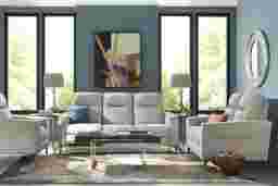 A sleek design and upscale vibe make the Drew & Jonathan Parkside Heights reclining collection the ultimate lounging experience for your living space. Upholstered in top grain leather where the body touches, this modern set features sophisticated track arms, textured stitching for a provocative visual element and tapered legs with a nickel finish. The dual power reclining function allows adjustment in the headrest and footrest for optimal relief and relaxation. Upholstery: Top grain leather where the body touches and polyurethane fabric sides and backs. Leather is a durable, low maintenance product; however, general regular maintenance is necessary. To keep your leather clean, vacuum it regularly, removing any dust, and clean it with water and a mild non-detergent soap. Accent pillows not included. Tables not as shown in room image.