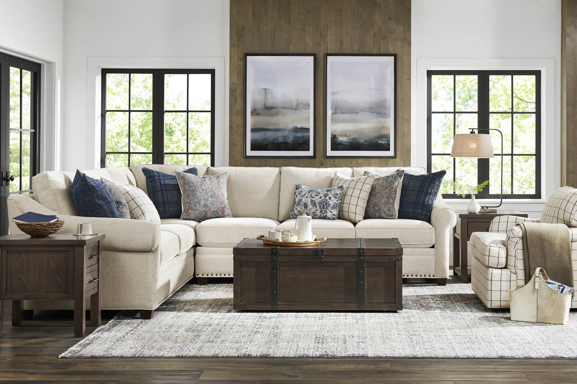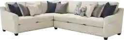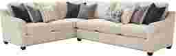 A sun-drenched afternoon spent in the relaxing comfort of the Parkview collection from Cindy Crawford Home blends into entertaining evenings in its intimate warmth and effortless sophistication. Contemporary in style, this sectional is upholstered in plush chenille with a classic beige hue for a timeless appeal. Welted seems highlight the loose, pillowy cushions and swooping roll arms, accentuating elegant curves and graceful lines. Coordinating accent pillows complete the look while the nailhead trim along the base adds a final touch of refined sophistication. Upholstery: 100% Polyester.