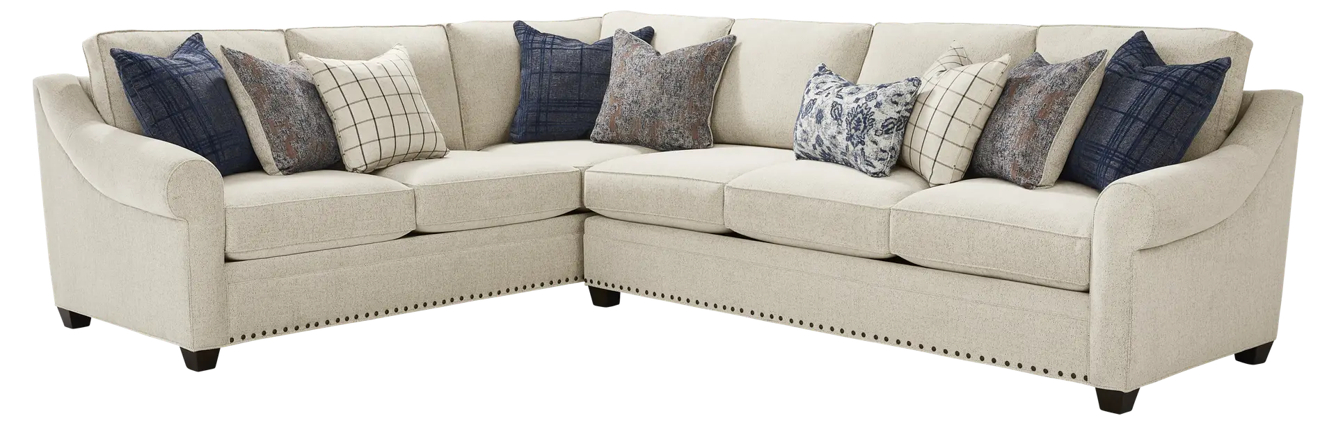 This sectional achieves a sophisticated contemporary aesthetic through its blend of graceful lines and tailored details. Key elements include swooping roll arms and welted seams that highlight the clean, elegant curves of the loose, pillowy cushions. Additionally, the nailhead trim along the base provides a final touch of refined craftsmanship, serving as a hallmark of quality that elevates the sectional's overall presence.