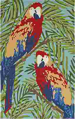 Step into a Caribbean paradise with the Parrots Roost. Inspired by the flora and fauna of Puerto Rican forests, this bright rug captures the natural beauty of native birds in shades of green, red, yellow and blue. This rug is handmade in China of UV treated polypropylene for maximum durability and clean-ability in your indoor and outdoor spaces. Spot clean as needed or for best results, please contact your local area rug cleaning professional.