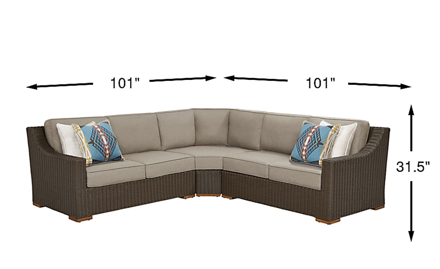 With light and airy French Provencal style, the Patmos outdoor sectional offers classic relaxation and a perfectly casual look. Crafted of woven all-weather wicker in a brown finish, this piece features a powder-coated aluminum frame with gracefully sloping arms and square teak feet. The cushions of this sectional are upholstered in mushroom-colored Sunbrella outdoor performance fabric. Coordinating accent pillows are included. 100% Sunbrella fabric. To clean Sunbrella fabric cushions remove dirt and spray on cleaning solution (water and mild soap), then use a soft bristle brush or sponge. Allow cleaning solution to soak into fabric and rinse thoroughly until soap residue is removed. Air dry. Do not dry clean.