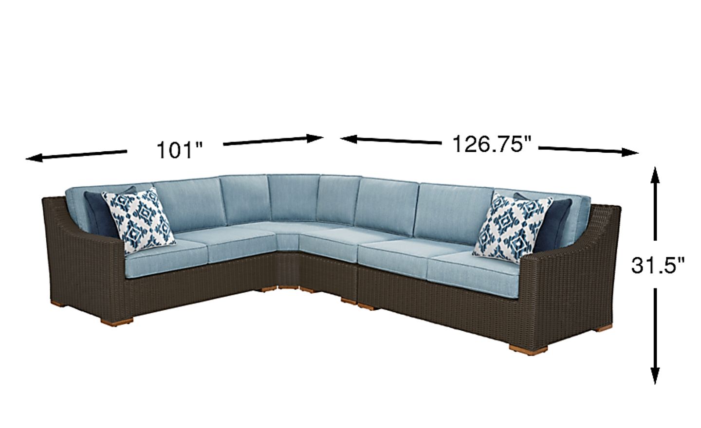 With light and airy French Provencal style, the Patmos outdoor sectional offers classic relaxation and a perfectly casual look. Crafted of woven all-weather wicker in a brown finish, this piece features a powder-coated aluminum frame with gracefully sloping arms and square teak feet. The cushions of this sectional are upholstered in steel-colored InsideOut outdoor performance fabric. Coordinating accent pillows are included. Select cushion colors available in Sunbrella fabric.
