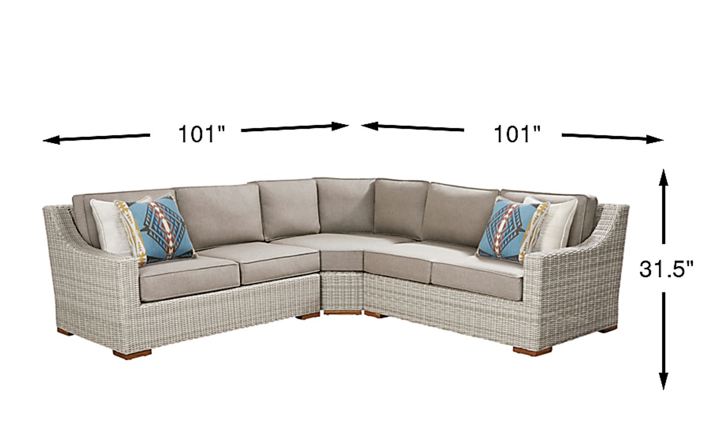 With light and airy French Provencal style, the Patmos outdoor sectional offers cassic relaxation and a perfectly casual look. Crafted of woven all-weather wicker in a gray finish, this piece features a powder-coated aluminum frame with gracefully sloping arms and square teak feet. The cushions of this sectional are upholstered in mushroom-colored Sunbrella outdoor performance fabric. Coordinating accent pillows are included. 100% Sunbrella fabric. To clean Sunbrella fabric cushions remove dirt and spray on cleaning solution (water and mild soap), then use a soft bristle brush or sponge. Allow cleaning solution to soak into fabric and rinse thoroughly until soap residue is removed. Air dry. Do not dry clean.