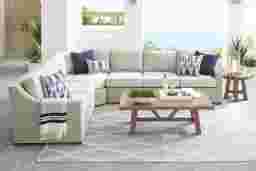 With light and airy French Provencal style, the Patmos outdoor sectional offers classic relaxation and a perfectly casual look. Crafted of woven all-weather wicker in a gray finish, this piece features a powder-coated aluminum frame with gracefully sloping arms and square teak feet. The cushions of this sectional are upholstered in linen-colored Sunbrella outdoor performance fabric. Coordinating accent pillows are included. 100% Sunbrella fabric. To clean Sunbrella fabric cushions remove dirt and spray on cleaning solution (water and mild soap), then use a soft bristle brush or sponge. Allow cleaning solution to soak into fabric and rinse thoroughly until soap residue is removed. Air dry. Do not dry clean.