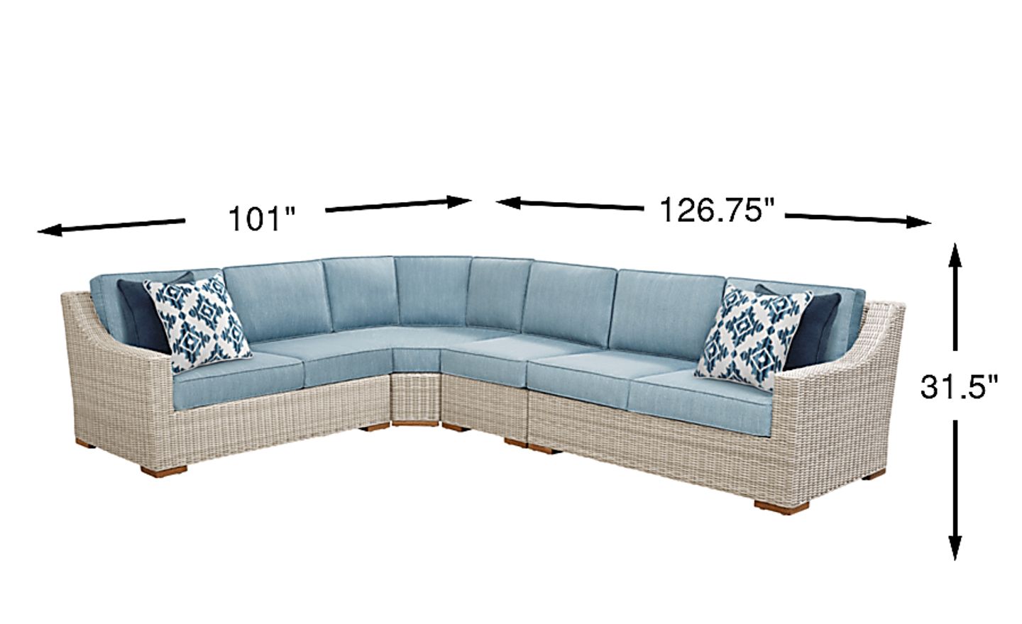 With expansive dimensions of 126.75"w x 100.75"d, this sectional is specifically designed for large patios, decks, or open-concept outdoor living areas. The 4-piece configuration provides significant seating capacity for hosting guests, while the "French Provencal" design—featuring gracefully sloping arms and coordinating accent pillows—creates a sophisticated yet casual focal point for large-scale entertaining.
