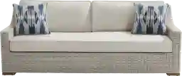 Evoking breezy French Provencal style, the Patmos sofa's classic design and casual feel will turn your backyard into an outdoor oasis. Crafted with all-weather woven wicker in a gray finish, it combines generously proportioned seats and gracefully sloping arms with a slim silhouette. Each durable linen colored Sunbrella cushion is resistant to UV rays, mold and mildew, making them easy to care for. Decorative toss pillows add a designer touch. Select cushion colors also available in Sunbrella fabric.