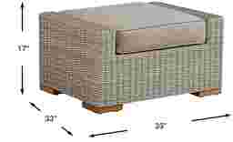 The perfect addition to its matching set, the Patmos ottoman enhances your outdoor comfort with padded cushioning and a breezy relaxed look. Crafted from woven wicker in a gray finish, it's not only a great place to stretch out your legs, but it can also serve as an extra seat for an unexpected guest. Inspired by French Provencal style, the durable mushroom colored Sunbrella cushion is easy to clean and resistant to UV rays, mold and mildew. 100% Sunbrella fabric. To clean Sunbrella fabric cushions remove dirt and spray on cleaning solution (water and mild soap), then use a soft bristle brush or sponge. Allow cleaning solution to soak into fabric and rinse thoroughly until soap residue is removed. Air dry. Do not dry clean.