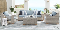 Evoking breezy French Provencal style, the Patmos sofa's classic design and casual feel will turn your backyard into an outdoor oasis. Crafted with all-weather woven wicker in a gray finish, it combines generously proportioned seats and gracefully sloping arms with a slim silhouette. Durable, outdoor performance InsideOut cushions in a steel color are easy to care for, while decorative toss pillows add an amazing designer touch. Cushions available in InsideOut.