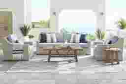 Evoking breezy French Provencal style, the Patmos sofa's classic design and casual feel will turn your backyard into an outdoor oasis. Crafted with all-weather woven wicker in a gray finish, it combines generously proportioned seats and gracefully sloping arms with a slim silhouette. Durable, outdoor performance InsideOut cushions in a steel color are easy to care for, while decorative toss pillows add an amazing designer touch. Cushions available in InsideOut.
