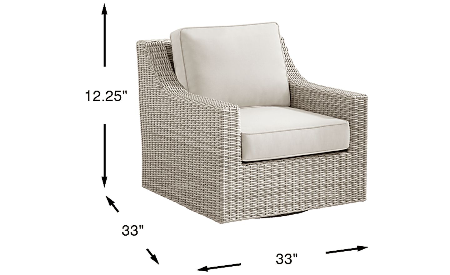 Helping you seize leisurely moments in your backyard, the Patmos swivel rocker is the perfect place to lounge after a long day. Inspired by French Provencal style, it's crafted of woven wicker in a gray finish and features gracefully sloped arms and a slim silhouette. Each durable linen colored Sunbrella cushion is colorfast as well as mold and mildew resistant. Gentle swivel and rocking capabilities provide additional ways to unwind. 100% Sunbrella fabric. To clean Sunbrella fabric cushions remove dirt and spray on cleaning solution (water and mild soap), then use a soft bristle brush or sponge. Allow cleaning solution to soak into fabric and rinse thoroughly until soap residue is removed. Air dry. Do not dry clean.