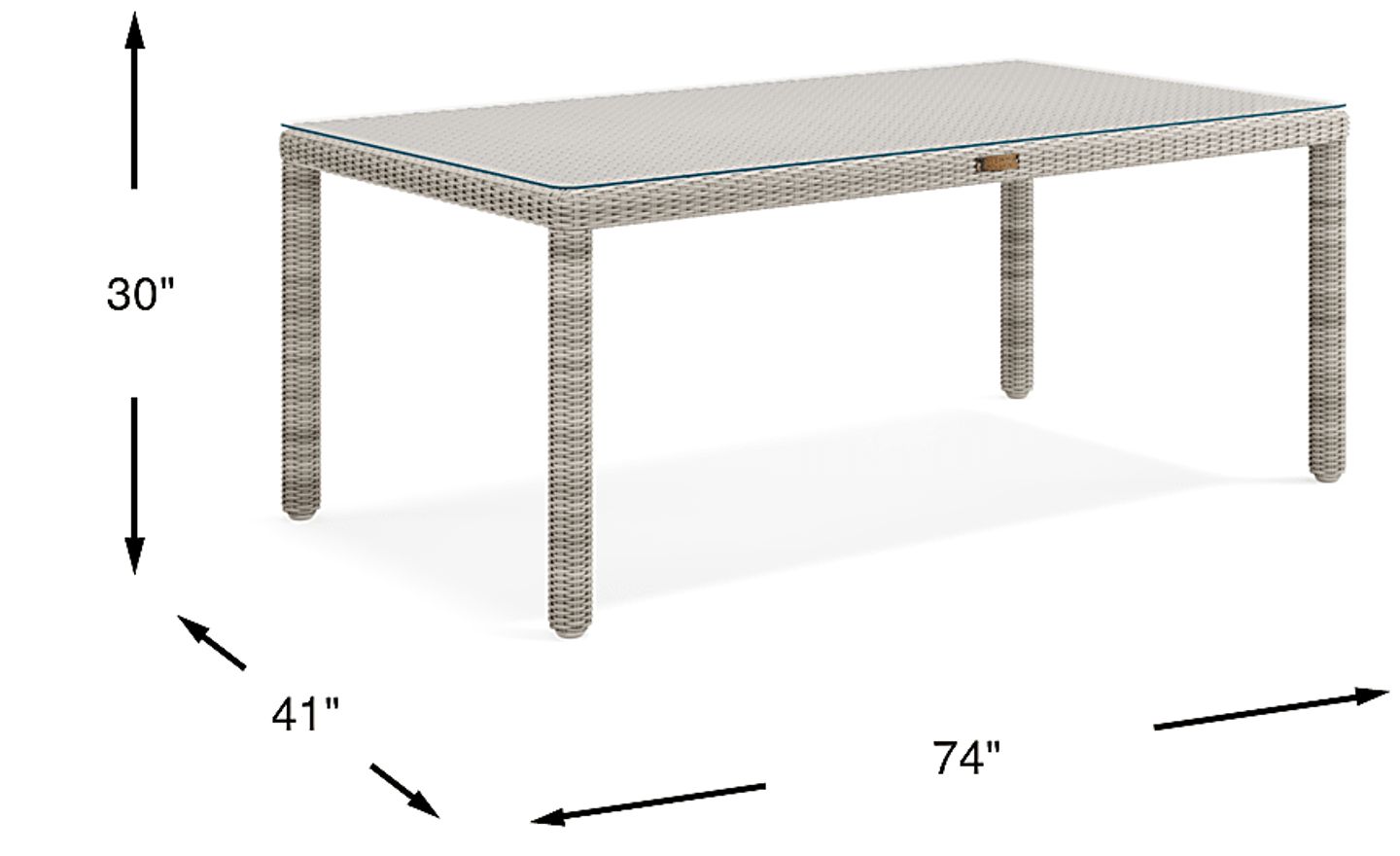 Gather in French Provencal style with the Patmos outdoor dining table. The casual 41 x 74 inch table, topped with smooth clear glass, is crafted with gray woven wicker and supported by straight sturdy legs.