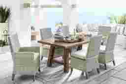 Enjoy the beauty and durability of natural eucalyptus with the Patmos wood dining collection. Made for outdoor parties and refreshments, this set includes a tan 78 x 43 inch table with a plank style top. An umbrella hole in the center of the table can be capped when not in use. Four beautiful gray wicker chairs with durable outdoor cushions in a linen color complete the group in casual style. 100% Sunbrella fabric. To clean Sunbrella fabric cushions remove dirt and spray on cleaning solution (water and mild soap), then use a soft bristle brush or sponge. Allow cleaning solution to soak into fabric and rinse thoroughly until soap residue is removed. Air dry. Do not dry clean.