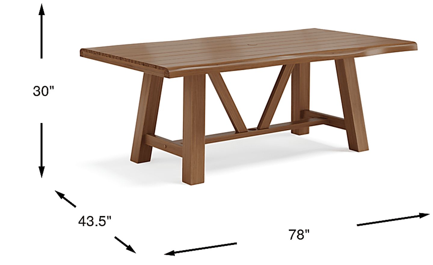 Perfectly sized to accommodate a crowd, the Patmos wood table is a great outdoor dining option. Featuring open, trestle legs and sturdy, solid eucalyptus wood frame in a tan finish, this table has a 78 x 43 inch plank style top made for refreshing outdoor meals and snacks. An umbrella hole in the center of the table can be capped when not in use.