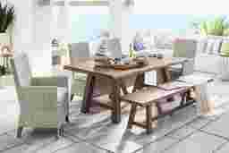 Perfectly sized to accommodate a crowd, the Patmos wood table is a great outdoor dining option. Featuring open, trestle legs and sturdy, solid eucalyptus wood frame in a tan finish, this table has a 78 x 43 inch plank style top made for refreshing outdoor meals and snacks. An umbrella hole in the center of the table can be capped when not in use.