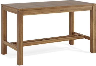 Perfectly sized to accommodate up to six people, the Patmos teak bar height table is a great outdoor dining option. Crafted of durable and long-lasting natural teak, this 71 x 35 inch table has a plank style top made for refreshing outdoor meals and snacks. An umbrella hole in the center of the table can be capped when not in use.