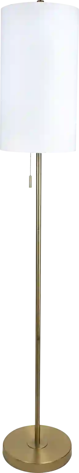 Versatile and minimalist, the contemporary Patricia Boulevard floor lamp showcases a unique metal slim-line body atop a round metal base, all in a gold plated finish. Topped by an elongated white linen drum shade and metal finial, this lamp is a chic addition to any aesthetic. Whether behind the couch, sitting next to your bed, stationed in the office, or even tucked in your favorite reading nook, this floor lamp is the stylish solution to your lighting needs. Partial assembly may be required.