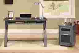 Wood, glass and metal elements combine to create a refreshingly contemporary and thoughtfully functional workspace. Crafted of solid poplar in a neutral gray finish, the Patrick Gray desk's black metal support legs and a stunning black tempered glass insert on the desktop create a modern, inviting feel. A slide out keyboard tray can also be utilized for storage or as additional workspace. Covered in soft, durable black UltraHyde, the chair's contoured padded seat, back and arms keep you comfortable, while smooth rolling caster wheels and adjustable seat settings make finding the perfect spot easy. Has 360 degree swivel potential. Some customer assembly required.