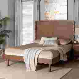 The headboard features a genuine woven rattan panel, a material highly regarded in furniture design for its lightweight durability and organic texture. Rattan brings a natural, breathable element to the bedroom, while the unique scalloped border adds a sophisticated, modern flair. This combination of materials makes the headboard a resilient yet visually light centerpiece that complements a variety of decor styles.