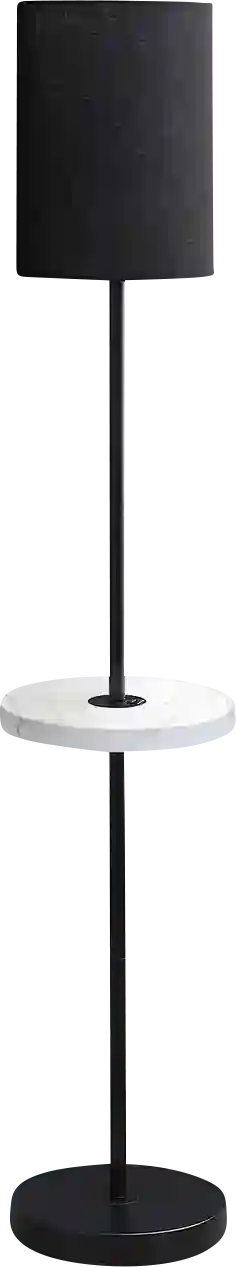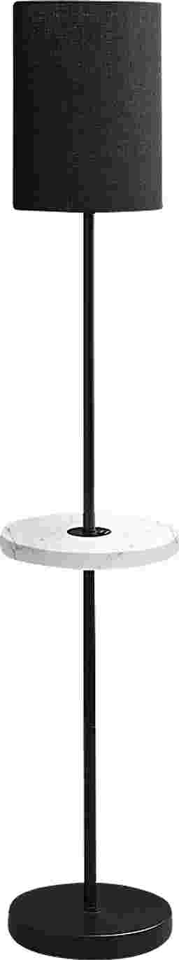 Illuminate your space with the chic and contemporary Pease Moor Black Floor Lamp with a convenient built-in shelf table. Crafted with sturdy black metal with a circular metal base with a white marble-look metal shelf table and topped with a tall drum fabric shade for a modern and luxurious look in your living room, bedroom, or office. It includes a USB port included on the shelf table to easily set your device for re-charging. The linen-blend black shade softens the light, and the rotary switch creates an ambiance that suits your mood or activity whether diving into a good book or setting the stage for a cozy evening. Partial assembly may be required.