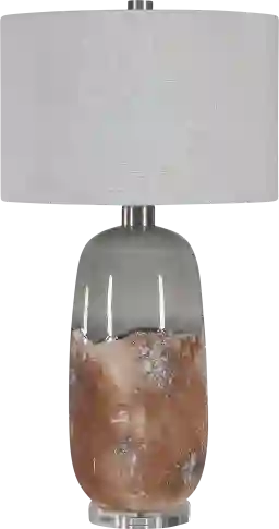 The Pebbleton lamp features a ceramic base finished in an earthy terracotta rust that transitions into a crackled green-gray glaze, accented with brushed nickel plated details and a thick crystal foot. Perfect to add a touch of earthy aesthetic to a modern or old fashioned room. The hardback drum shade is a warm gray linen fabric with natural slubbing. Partial assembly may be required.