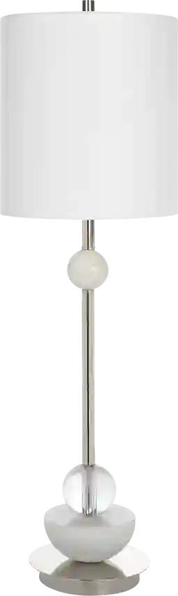 Sleek and refined, the contemporary Pecky Oaks lamp showcases a streamlined iron base in polished nickel with natural white marble and crystal accents. Paired with a hardback white linen fabric drum shade. Partial assembly may be required.